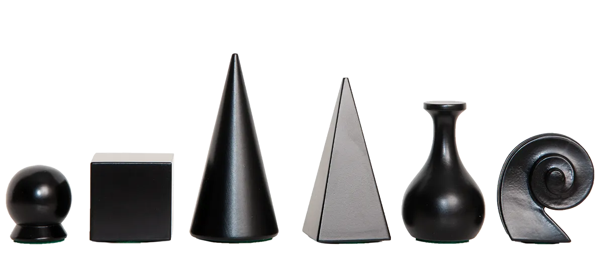 Man Ray designed this chess set in 1920 using found objects from his studio. Most of the pieces are geometric models made for still-life drawing (the king is a pyramid, the queen a cone, the rook a cube, the pawn a sphere).