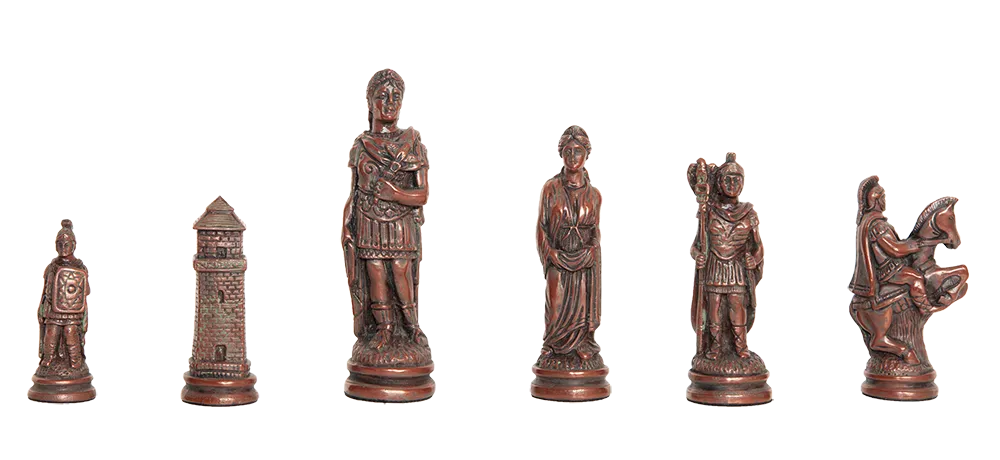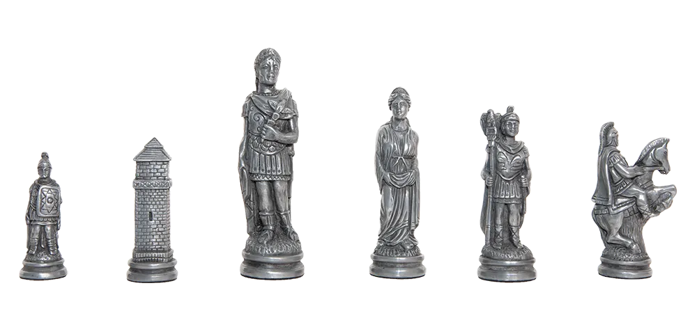 These chess pieces were recreated to show the imperious atmosphere of early Rome. As shown in photos, the King is a recreation of Julius Caeser in the Roman period, the Queen, A Lady of noble birth in a typical dress, the Bishop, A standard Bearer carrying the insignia of the Legion, the Knight, an equestrian soldier of the period, the Rook, A Roman garrison tower, and the Pawn, an armed Legionaire of the period. These chess pieces are heavily weighted and come in Metal and the pieces have a King height of 4.25" and a 1.3" base.