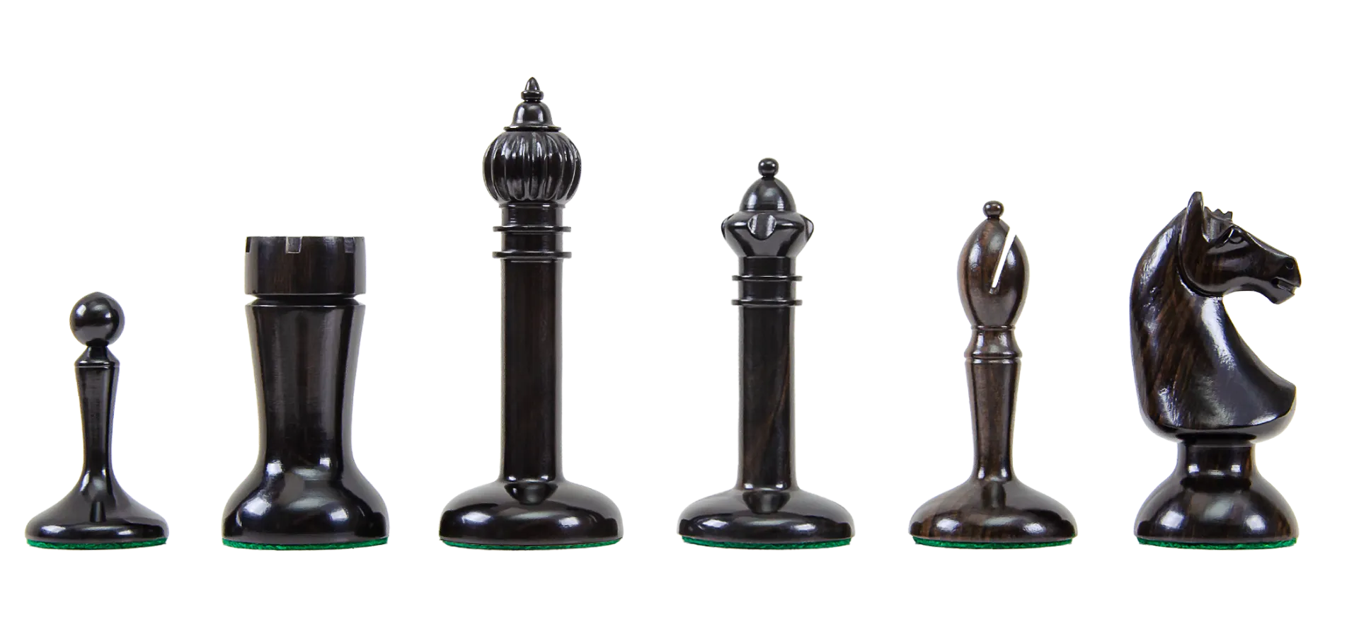 To pamper you, The House of Staunton is proud to offer the Circa 1910 Lasker Schlechter World Chess Championship Luxury Chess set. This full-tournament sized Chess set features. A full club-sized Chess set, it features a 4.5" King with a 1.7" diameter base. The Chess pieces are hand carved by our master artisans and crafted out of the highest grade woods. The Chess pieces are heavily weighted with embossed English Leather base pads under the Kings, luxurious billiard cloth base pads on the other Chess pieces.