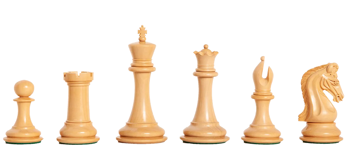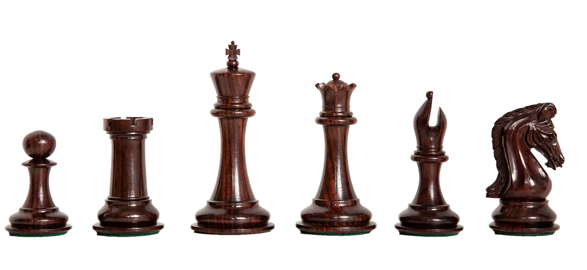To pamper you, The House of Staunton is proud to offer the Imperial Collector Series Luxury Chess set. This full-tournament sized chess set features a 4.4" King with a 1.85" diameter base. The Chess pieces are hand carved by our master artisans and crafted out of the highest grade woods. The chess pieces are heavily weighted with gold embossed English Leather base pads under the Kings and luxurious billiard cloth base pads on the other chess pieces. The Collector Series Luxury Chess set has been crafted to replicate the design and proportions of the original Staunton pattern chessmen, registered by Nathaniel Cooke in March of 1849 and first manufactured by Jaques of London in September 1849. The distinctive feature of this set is the the open-mitered Bishop and original Knight design, which was originally sculpted by the Maestro, Frank A. Camaratta, Jr. With it's downturned head, flowing mane and aggressive facial expression, this is one of the finest Knights ever to grace the 64 square battlefield.