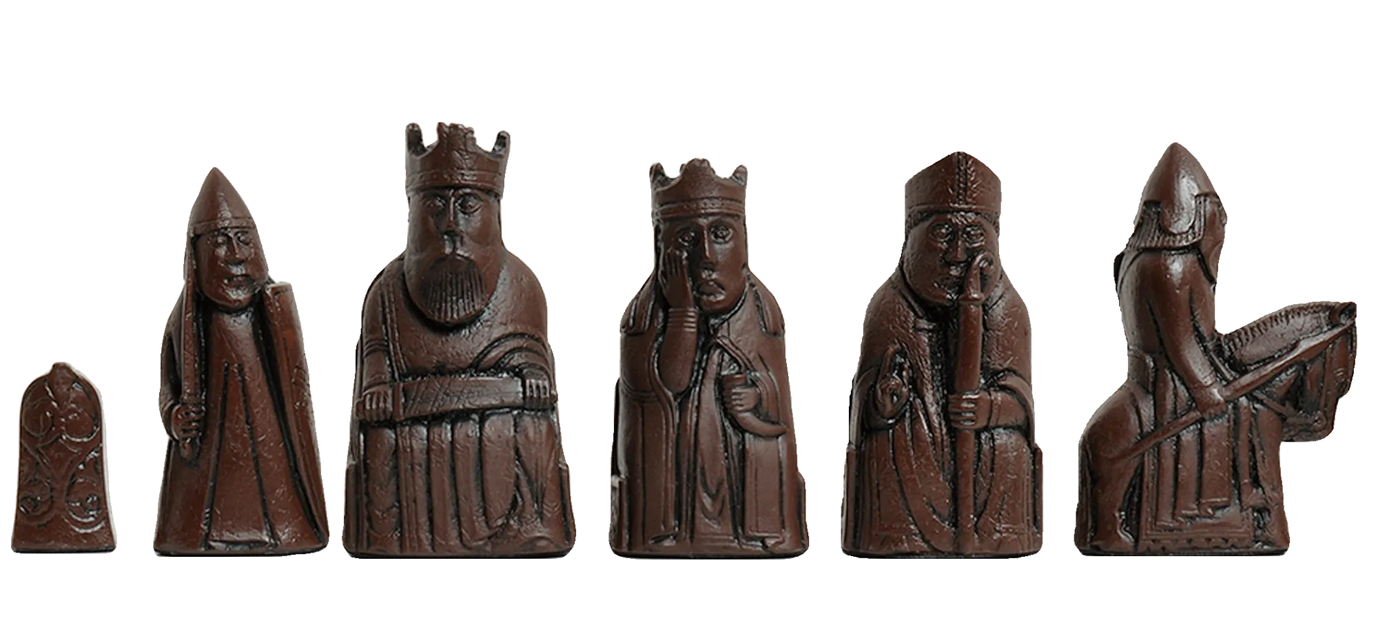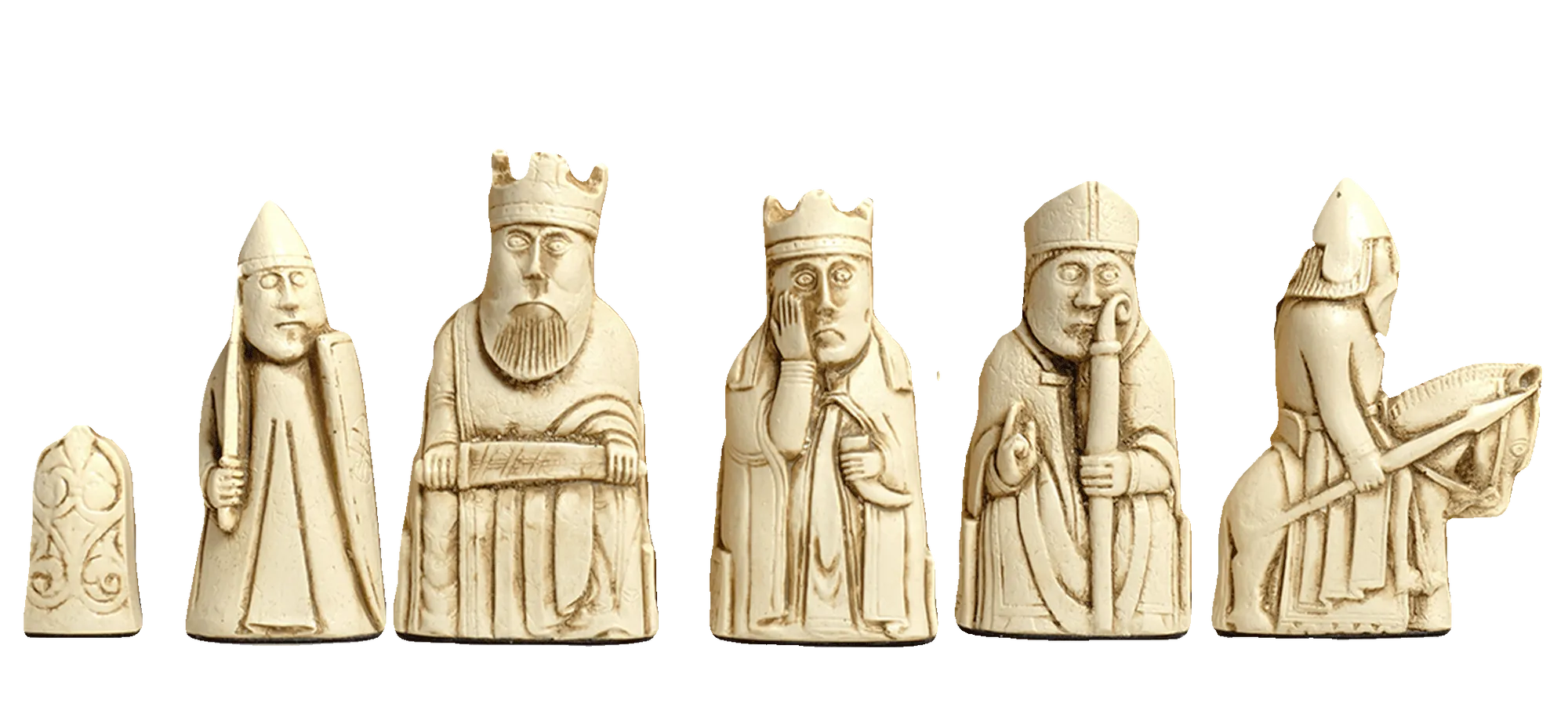 These chess pieces are replicas of the originals which were discovered on the Isle of Lewis off the West Coast of Scotland and which are now housed safely and securely in the British Museum of London and in Edinburgh. Many pieces were discovered and this is our interpretation of the Isle of Lewis chess set. The Isle of Lewis chessmen were featured in the movie, Harry Potter and the Sorcerer's Stone.