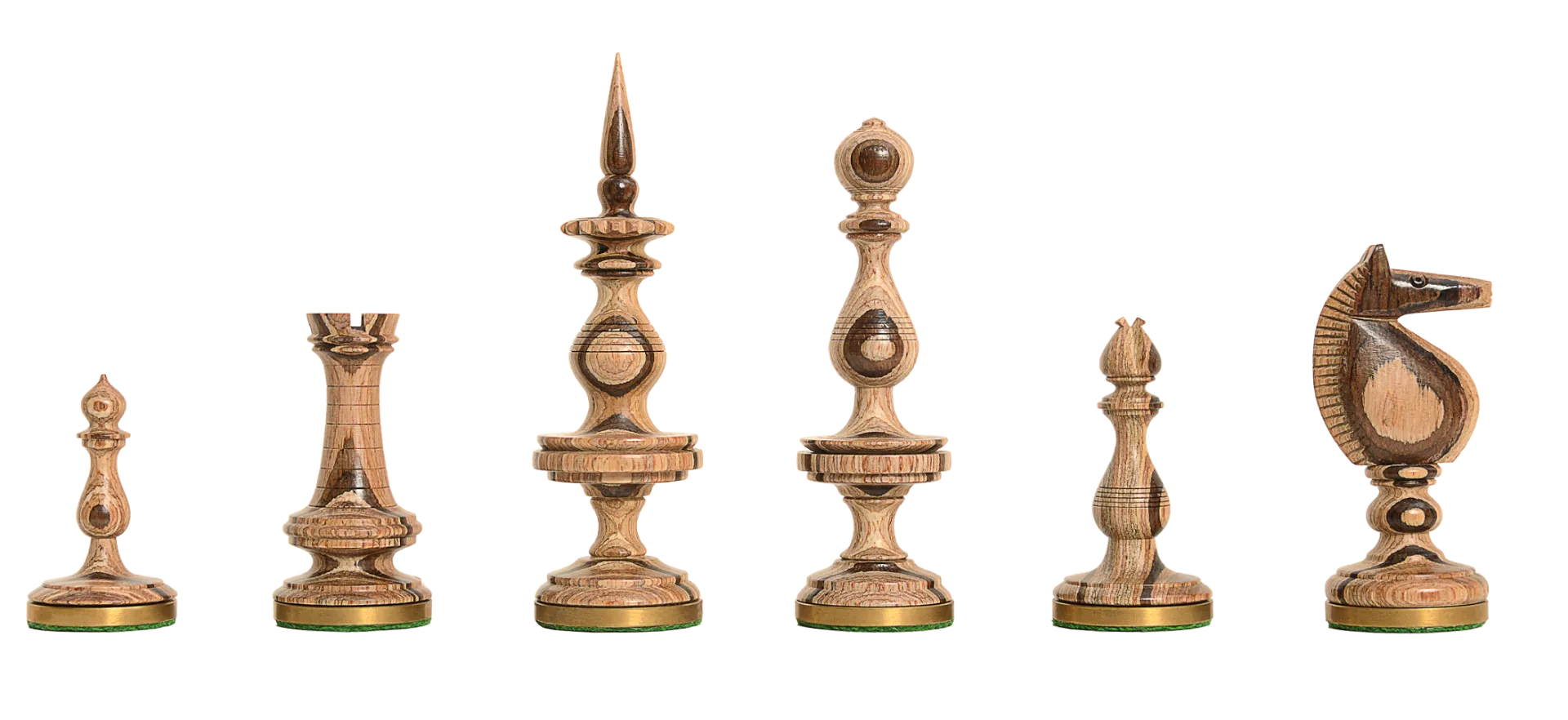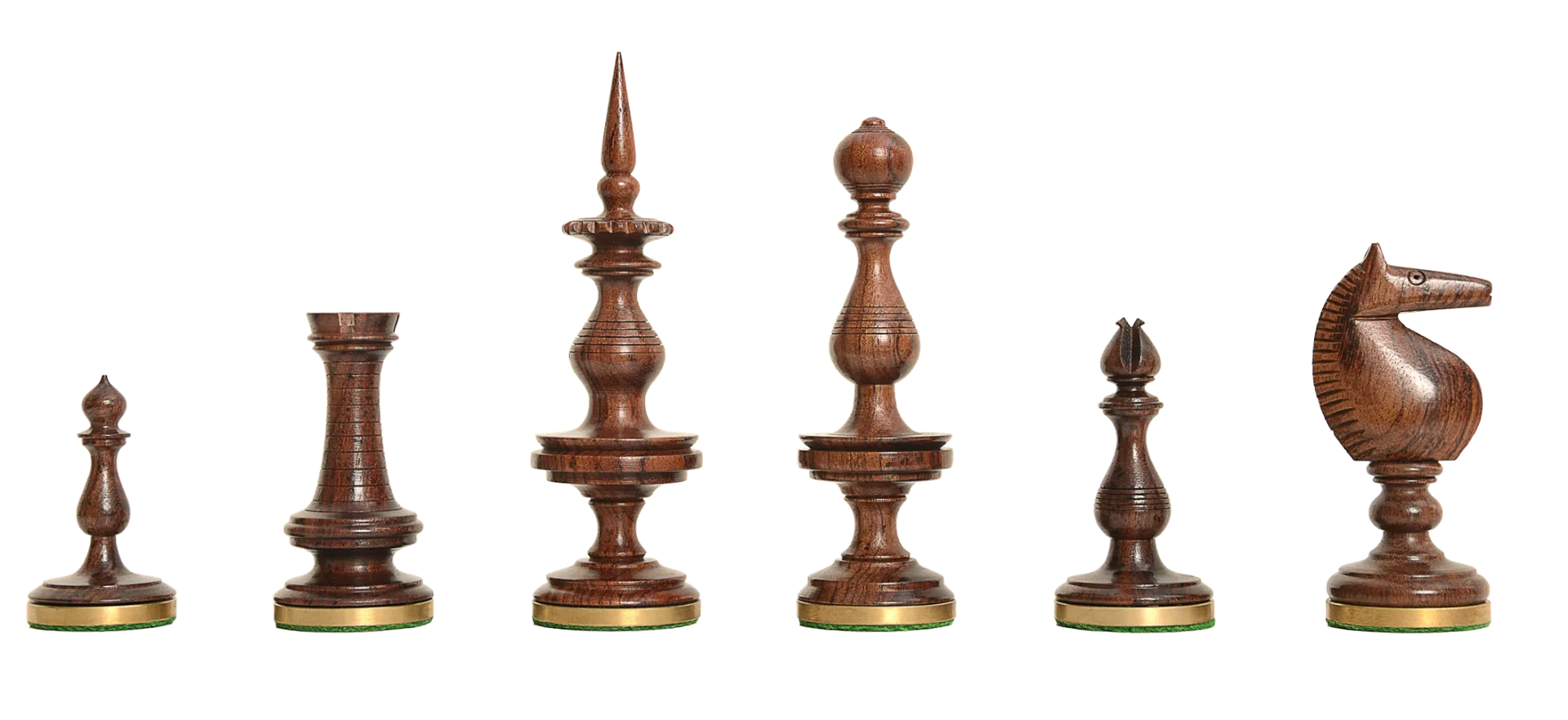 The original chessmen were turned from Arbutus and Yew woods. The use of Arbutus wood (i.e. the wood of the Strawberry Tree) is typical of Killarney. This close-grained wood had been highly valued for centuries in Ireland. Unfortunately, over time, these two woods became almost indistinguishable making the chessmen unsuitable for serious practical play. We chose a different species of exquisite exotic woods which will retain their beauty and sharp contrast with the passing of time.