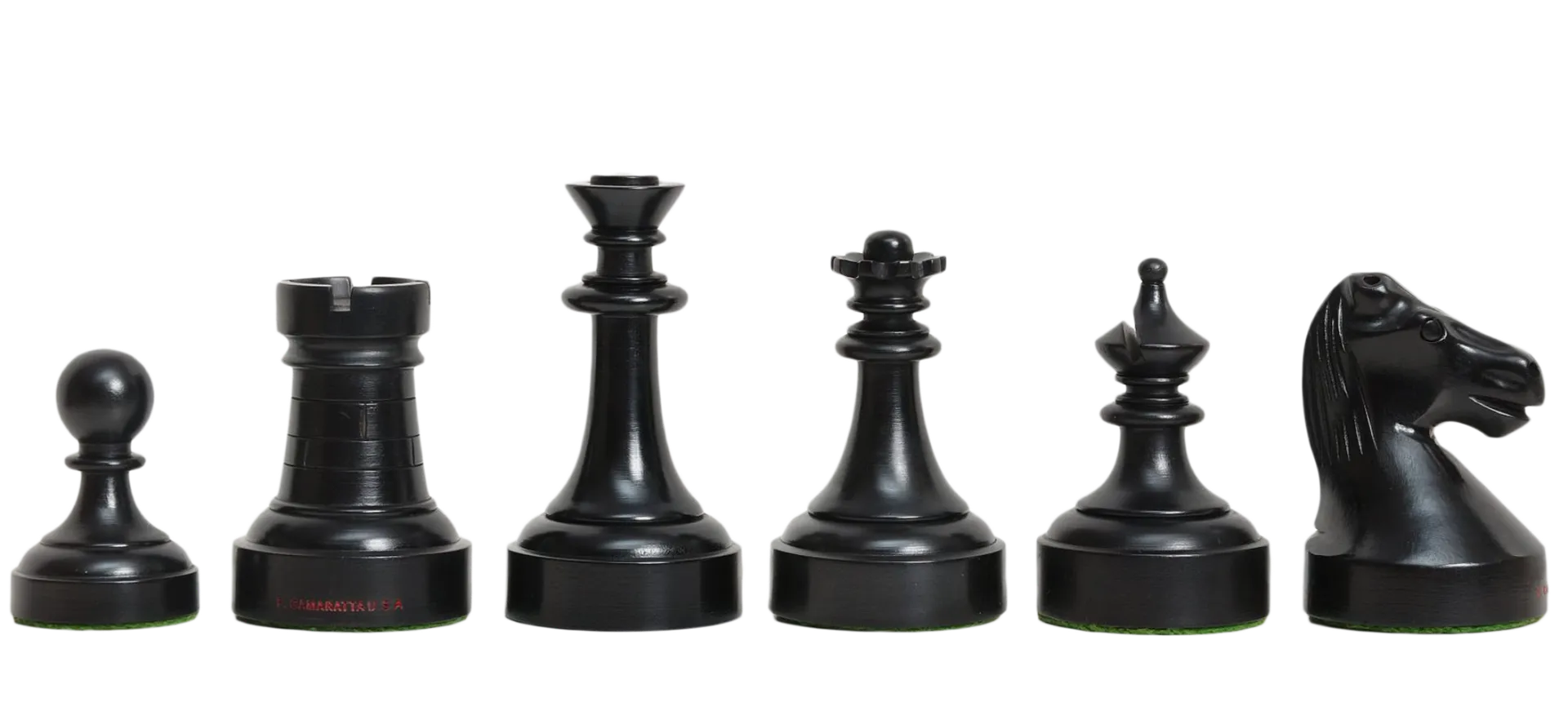 Offered here is a very accurate reproduction of the Mechanics Institute chessmen owned by Louis Persinger. The King stands 3.6” tall with a 2” diameter base, which is about equivalent to a Club-size Staunton set with a 4-3/8” King with its finial. The sets are available in Boxwood and Golden Rosewood, Ebonized Boxwood, Indian Rosewood or Ebony.