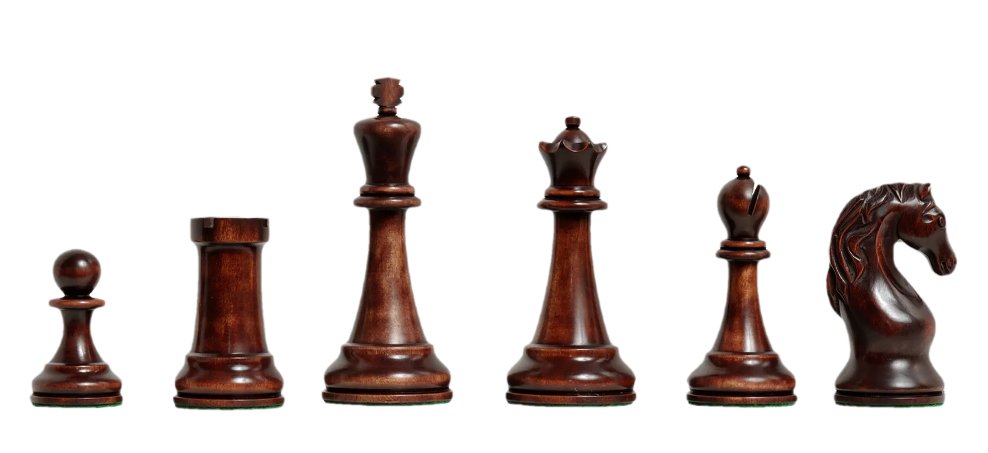 The House of Staunton is proud to offer the Piatigorsky Cup Series Chess Pieces. It features a 4.5" King with a 1.8" diameter base. The Chess pieces are hand carved by our master artisans and are the first set we've ever produced that features a Gorgeous distressed Mahogany patina, designed to have the look and feel of one of the actual Piatigorsky Cup sets. These chessmen are heavily weighted and feature billiard cloth base pads under the pieces.